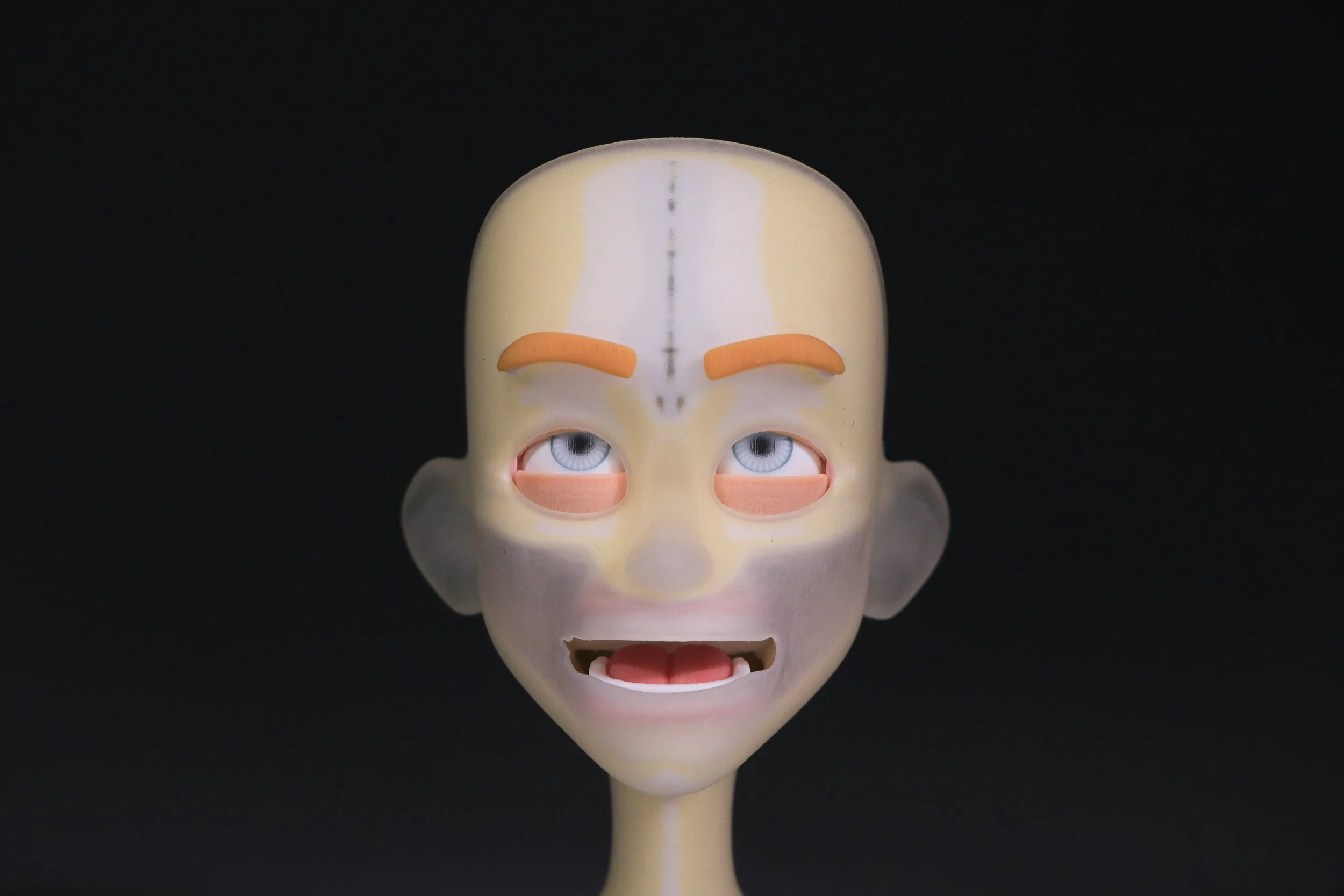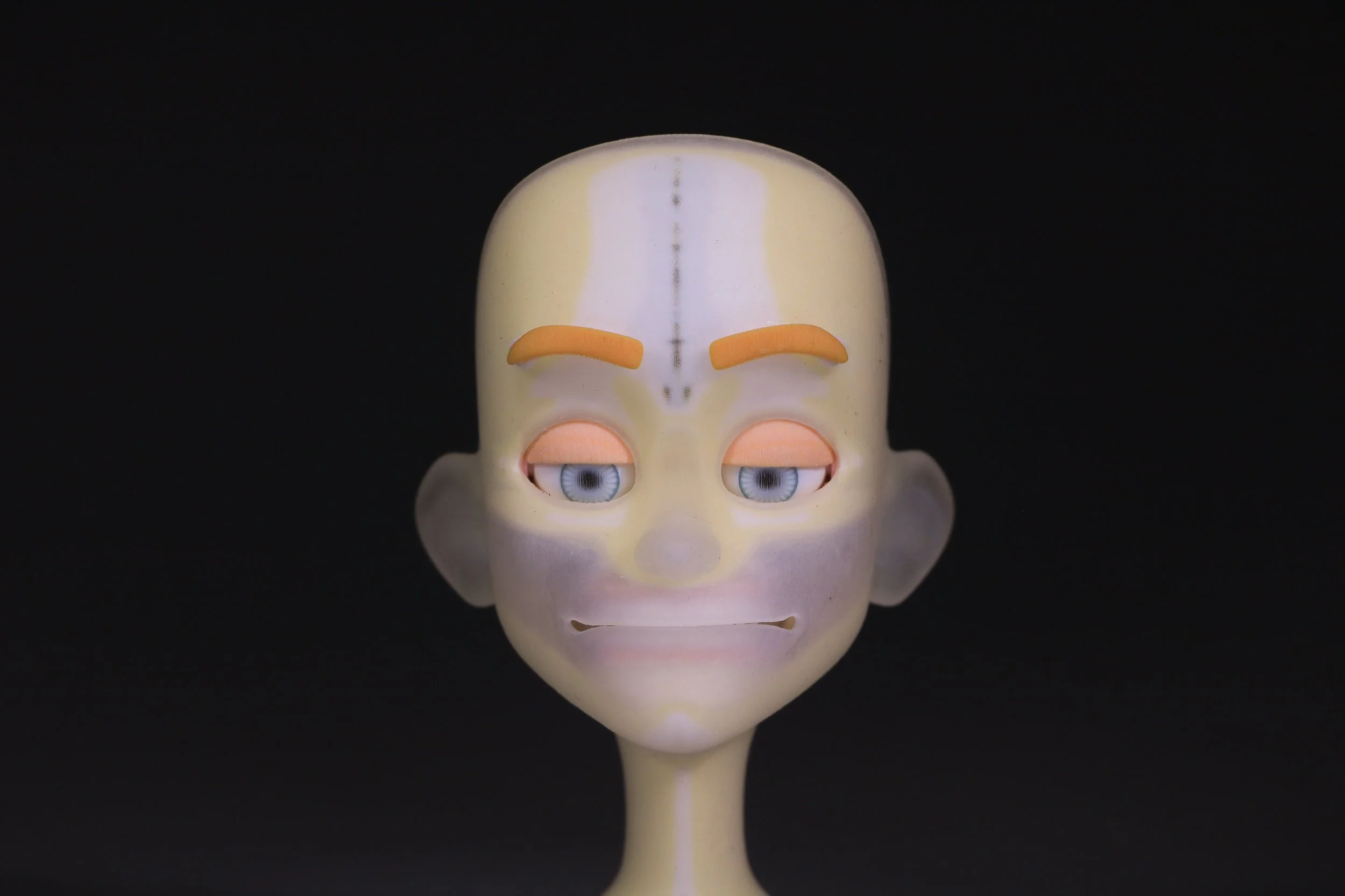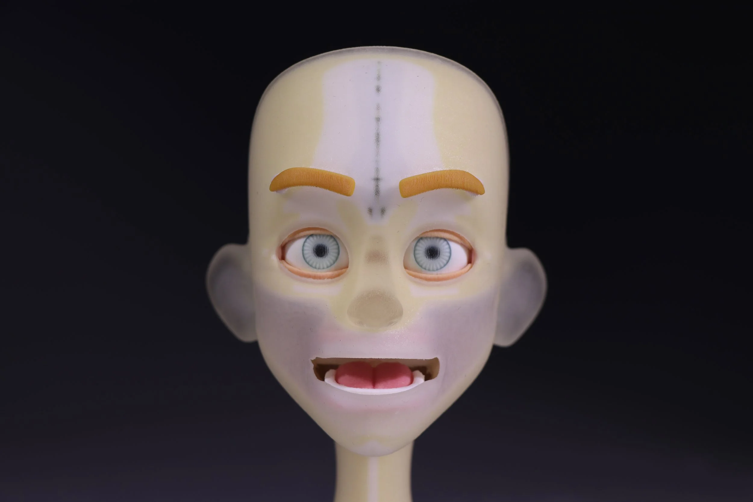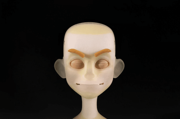 Inspiration was drawn from two award-winning Stop-Motion animation studios and combining their differing methods of facial animation. Mackinnon & Saunders’ work in Tim Burton’s Corpse Bride, and Laika Studios’ work on Missing Link. Using the ease/speed of manufacture exploited by Laika’s Stratasys Polyjet 3D printing advancements without needing to print every frame, and using Mackinnon & Saunder’s use of re-posable mechanics without having to meticulously handcraft each puppet.