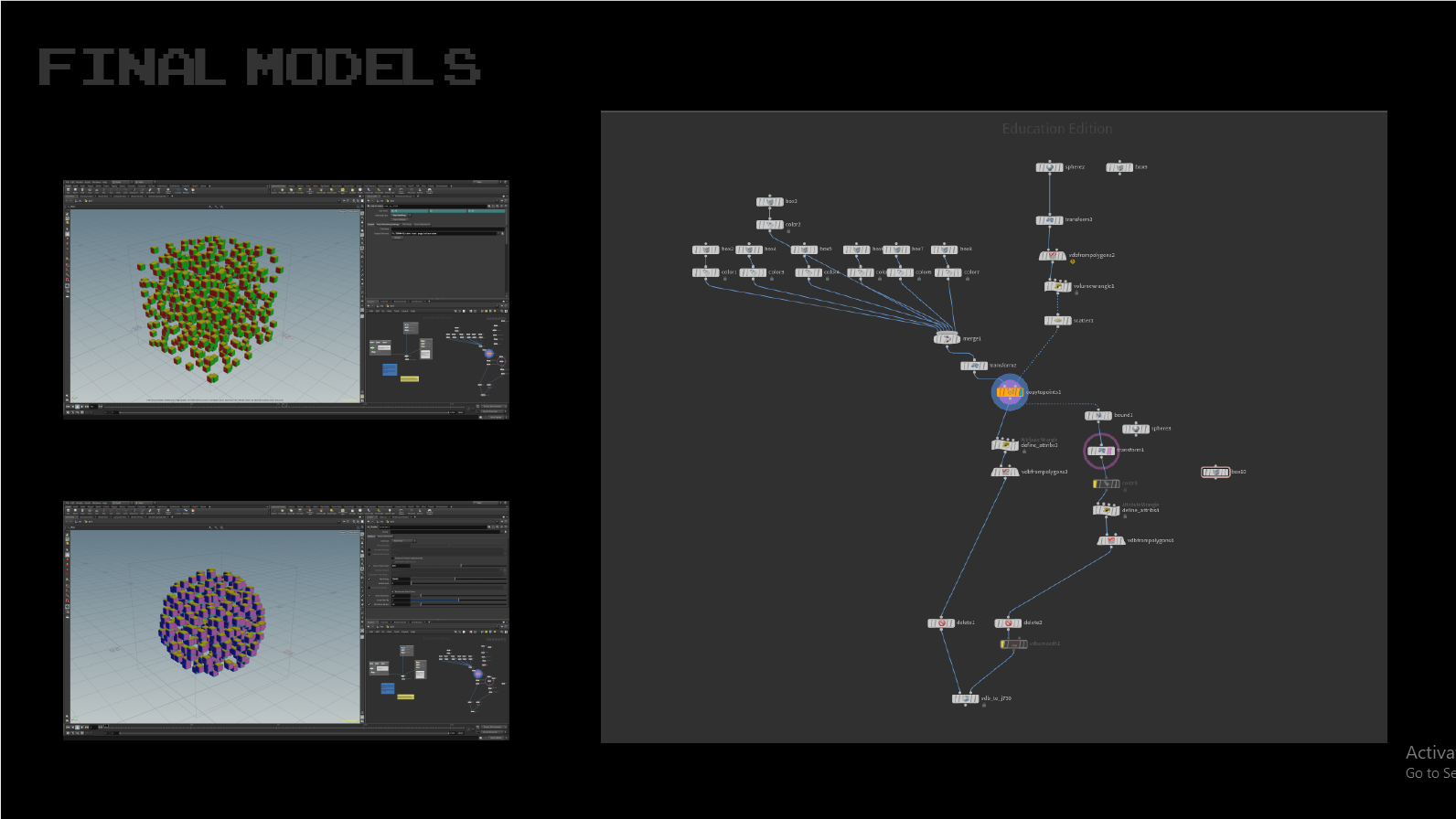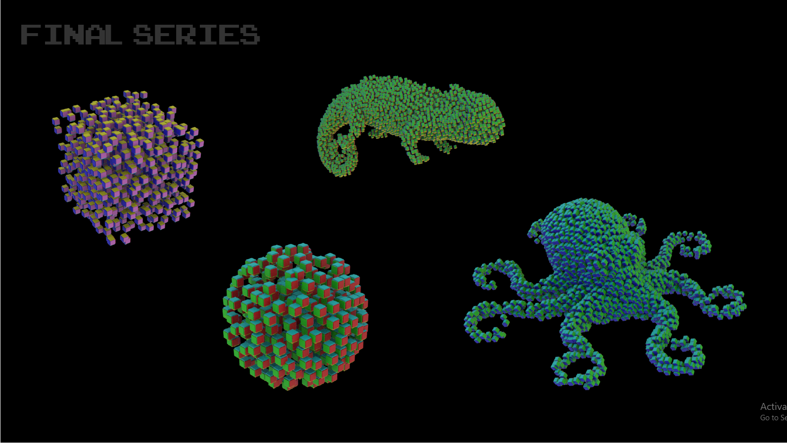 This was an experiment with the colour printing capabilities of the Stratasys J850 Poly-jet 3D Printer. Inspired by the colour-changing abilities of the Octopus and Chameleon, I wanted to use perspective change to alter colour. This was allowed by multi-coloured cubic nodes scattered throughout a volume and suspended in clear resin. The colours hiding, revealing and mixing depending on the angle of view and refraction. The digital model was made and rendered in Houdini. The model was procedurally created, then sliced into PNG’s to be voxel printed.