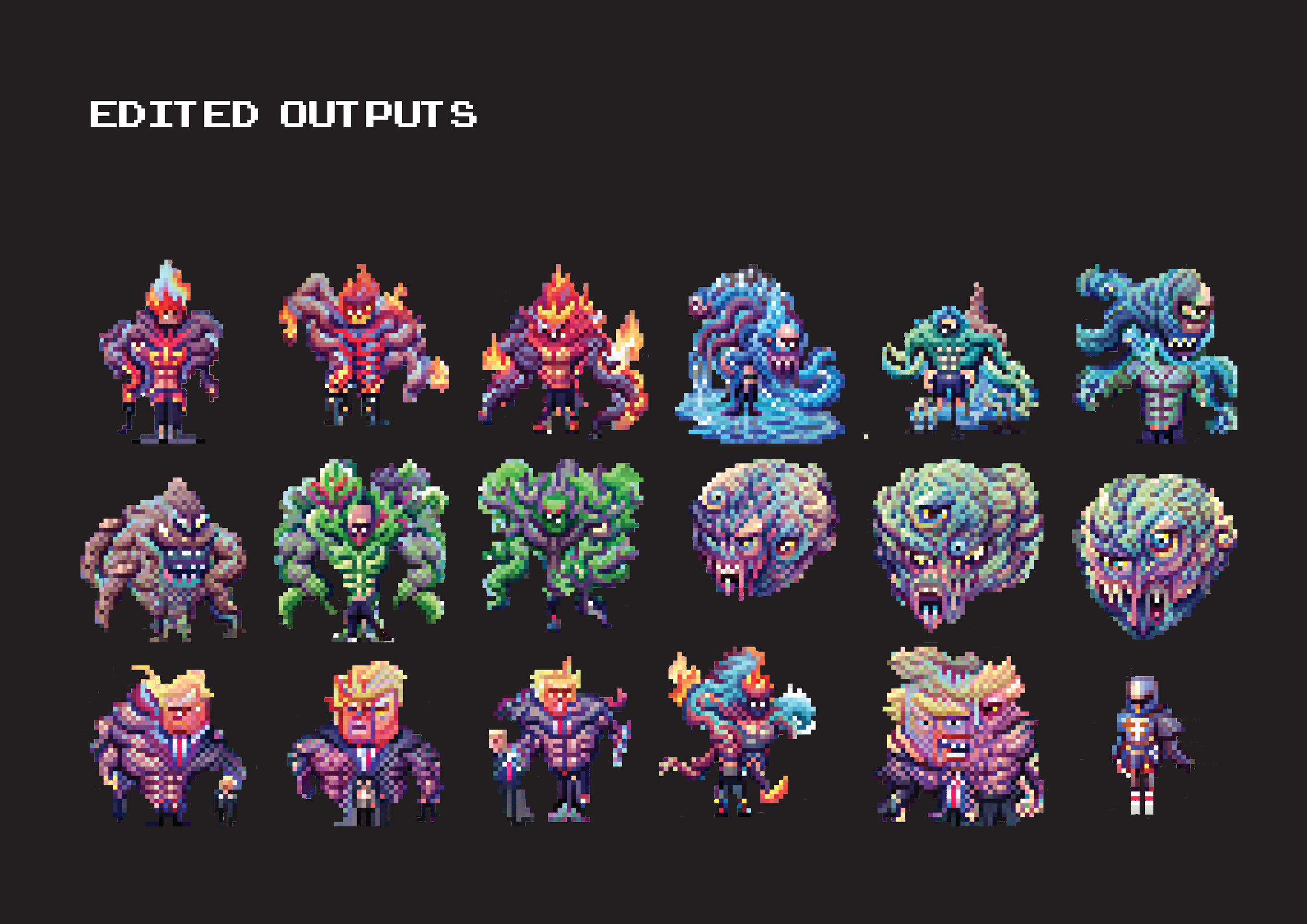 This was an experiment with a pixelated AI image generation script, a Generative Adversarial Network (GAN) accessed through Github. Bad Pixel is an 8-bit battle royale video game concept where villains are generated using simple word prompts that are added to additional background prompts, taking advantage of the GANs ability to produce unique imagery even if the word prompts are identical, aiding in its pick-up and replayability. Animated frame by frame in Premiere Pro.
